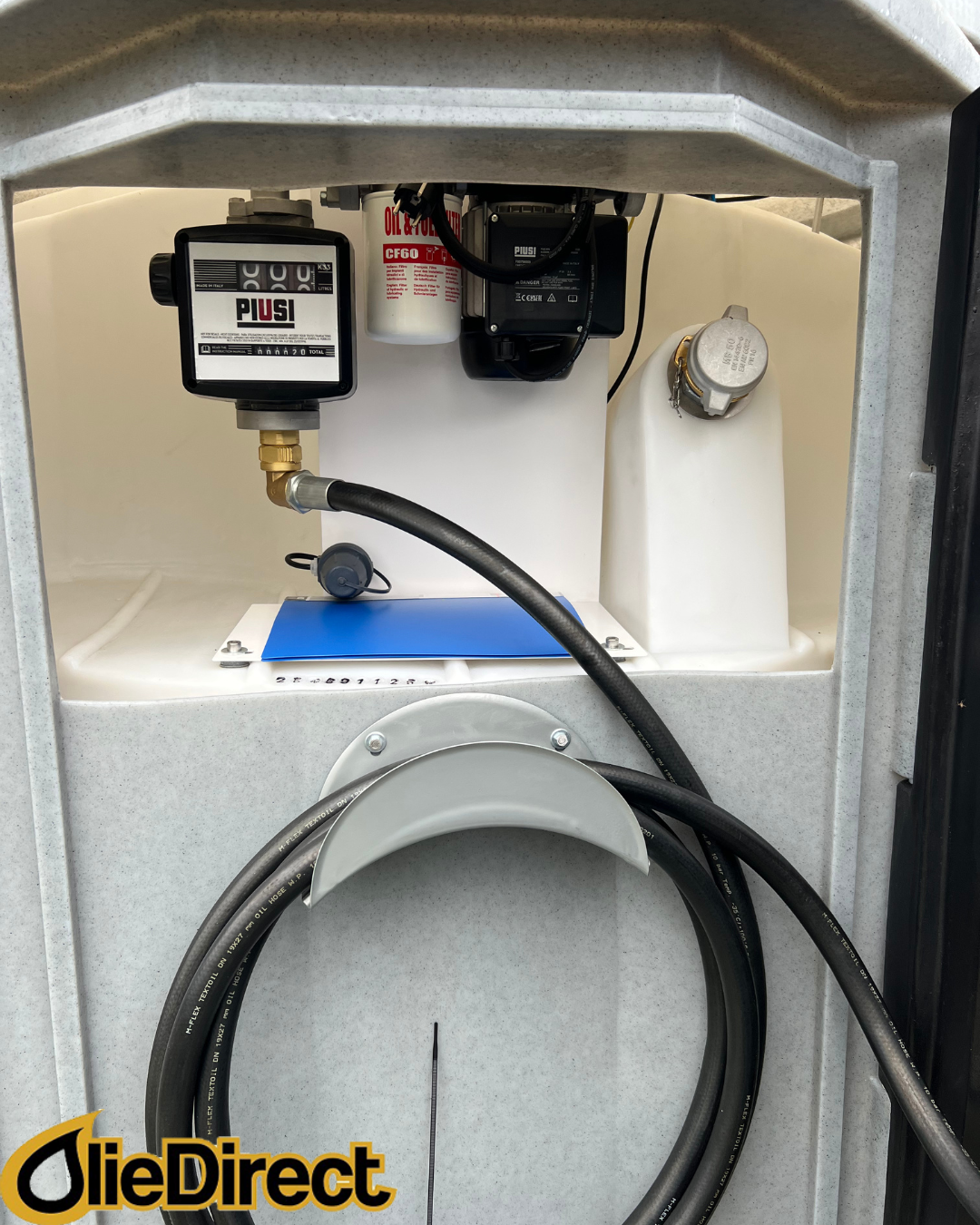 De tank wordt geleverd met een Piusi pomp van 56l/min. (230V) inclusief 6 meter slang met automatisch afslaand vulpistool en bewakingssystemen (lekdetectie en voorraadmeter en elektronische overvulbeveiliging).